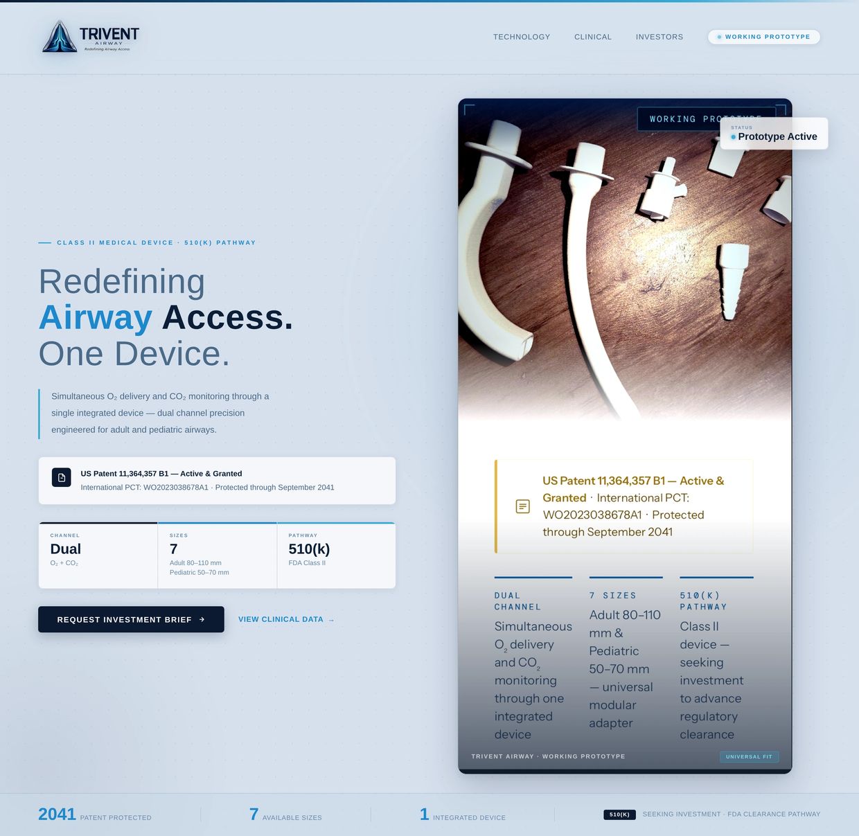 Trivent's dual-channel architecture is a fundamental rethinking of airway device design not a modification of existing products. Now a single device delivers oxygen while simultaneously sampling exhaled CO2 for real time capnography.